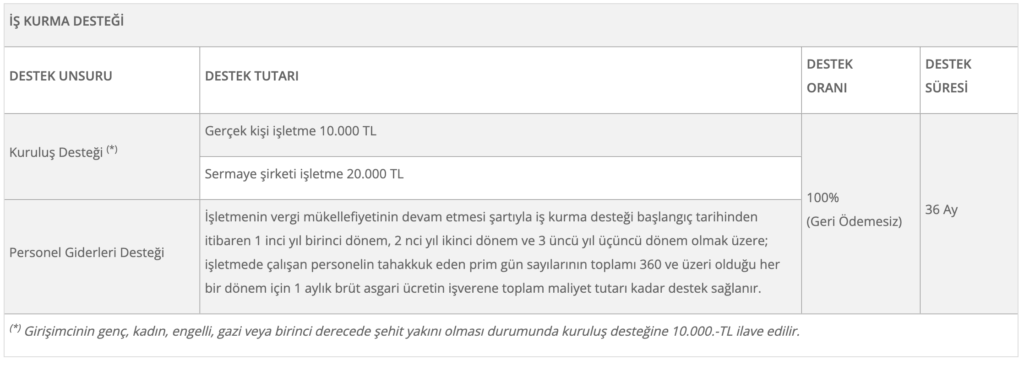 İş Kurma Desteği kapsamında girişimcilere yüzde 100 destek oranı ile geri ödemesiz olarak kuruluş ve personel desteği sağlanıyor. Gerçek kişi statüsünde kurulmuş olan işletmeye 10 bin TL, sermaye şirketi statüsünde kurulmuş olan işletmeye 20 bin TL tutarında kuruluş desteği veriliyor.