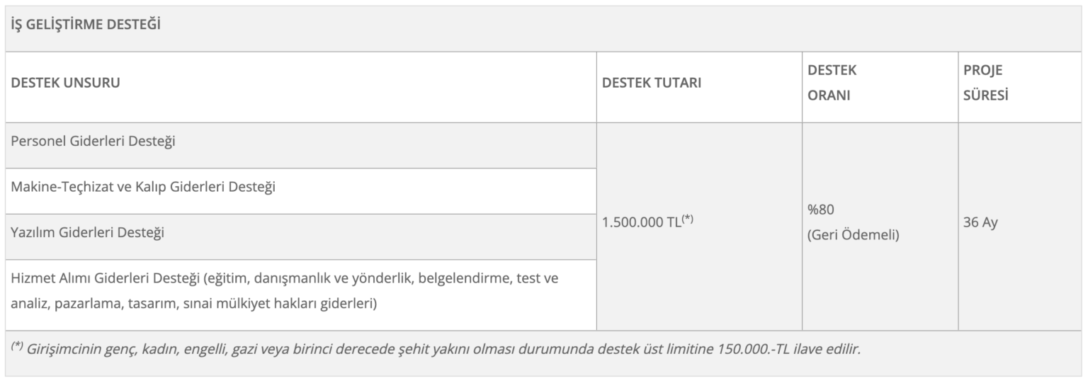 İş Geliştirme Desteği kapsamında ise girişimcilere 1,5 milyon TL üst limit dahilinde yüzde 80 destek oranı ile geri ödemeli olarak destek sağlanıyor. Girişimcinin genç, kadın, engelli, gazi veya birinci derecede şehit yakını olması durumunda destek üst limitine 150 bin TL daha ilave ediliyor.